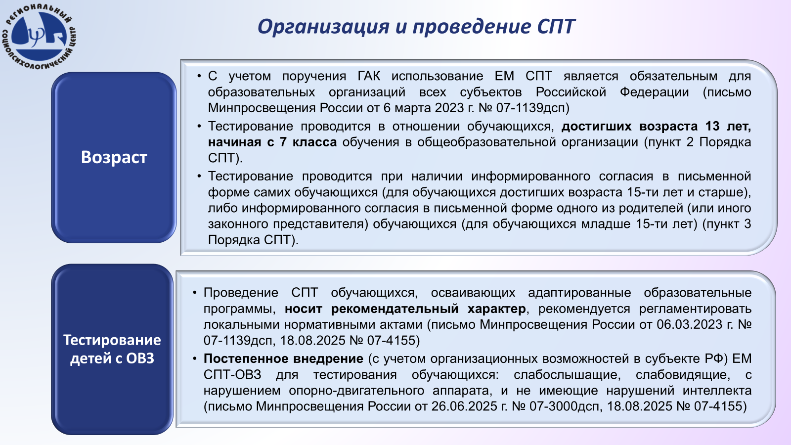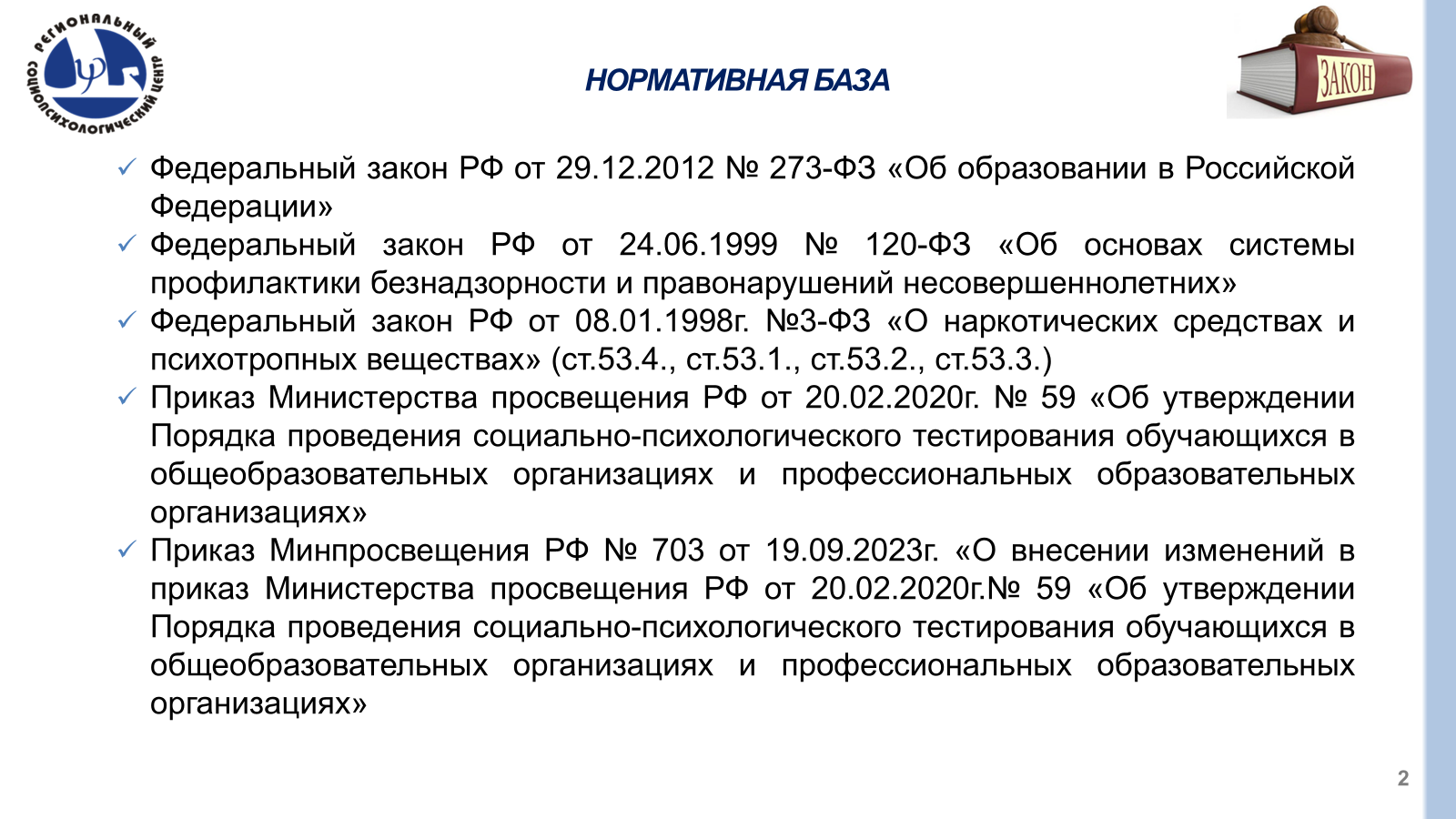 *утверждено Приказом Минпросвещения России № 703 от 19.09.2023г. «О внесении изменений в приказ Министерства просвещения РФ от 20.02.2020г.№ 59 «Об утверждении Порядка проведения социально-психологического тестирования обучающихся в общеобразовательных организациях и профессиональных образовательных организациях»)