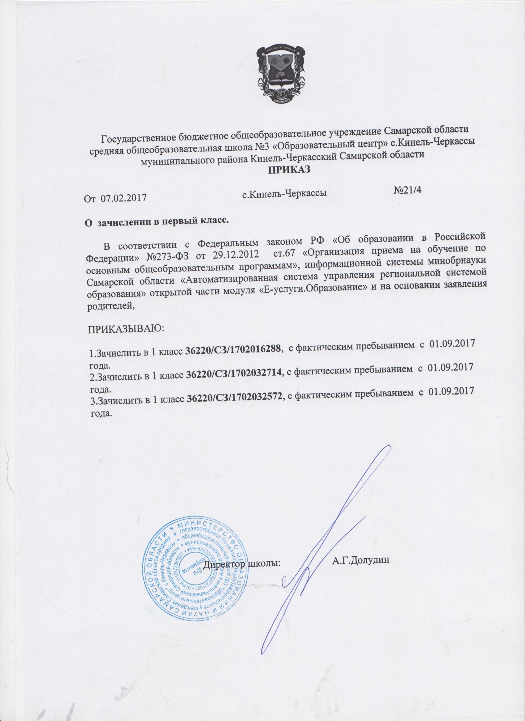 Приказ о зачислении в 1 класс от 07.02.2017